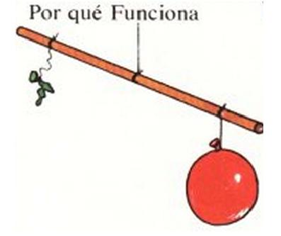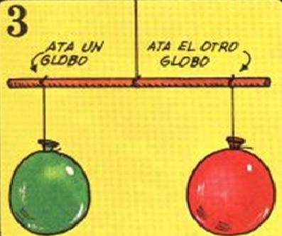Funciona porque cuando tú explotas un globo, sale todo el aire. El otro globo lleno de aire pesa más que el vacío, y es por eso que el palo se inclina.