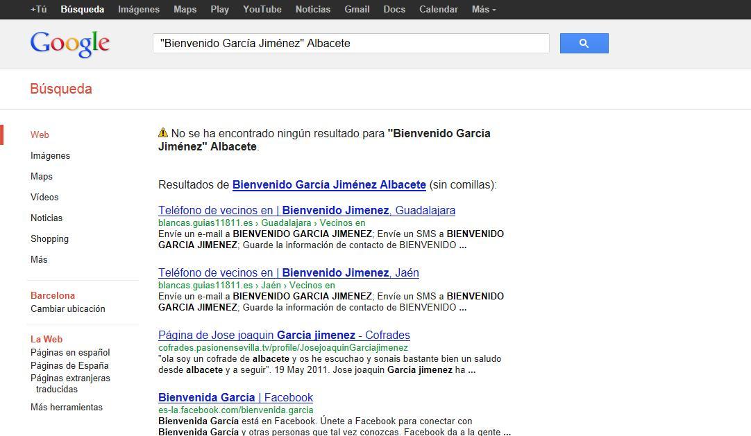 Otra forma de afinar la busca podrá ser añadir alguna otra información que sepamos sobre la persona de quien queremos obtener la información. Como apuntábamos antes, probablemente sepamos la ciudad donde vive o la empresa en que trabaja, así que también lo colocaremos en Google. Ejemplo: "Bienvenido García Jiménez" Albacete, que en esta ocasión el buscador no ha podido obtener resultados.