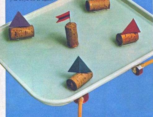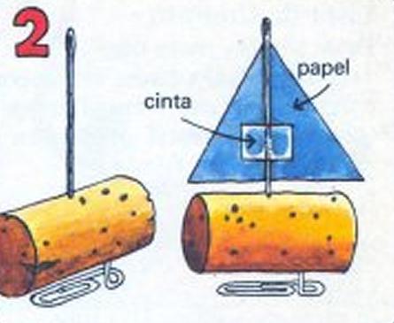 Para finalizar haz una boya de corcho para que los barcos corran alrededor. Mete un clavo en un extremo del corcho y una aguja en el otro. Corta una pequeña bandera de papel y fíjala a la aguja con cinta.