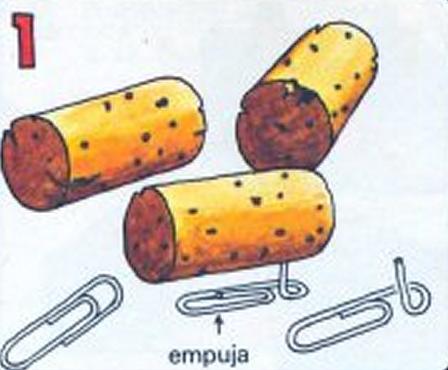 Primero de todo dobla un extremo de cada clip e introduce un extremo dentro de cada corcho igual como aparece en la image.