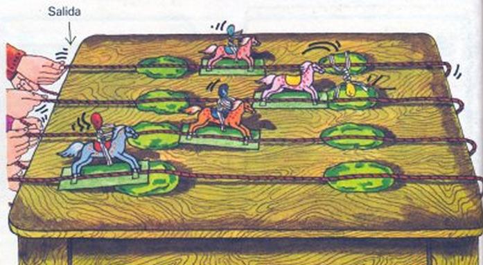 Cómo se juega: se trata de hacer correr a tu caballo de un extremo a otro de la mesa sin que el jockey se caiga. Los caballos deberán pasar sobre los obstáculos que encuentren en el camino y todo jugador cuyo jockey se caiga, volverá otra vez al principio. Para empezar, coloca los jockeys sobre las sillas y los caballos en la línea de salida. Colócate en el extremo de la mesa y tira hacia ti de la cuerda que está debajo. El primer jugador que llegue con jockey y caballo juntos a la meta será el ganador.