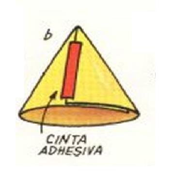 Luego pega el borde interior y el exterior con la cinta adhesiva y corta la parte superior del cono para que tenga un agujero pequeño.