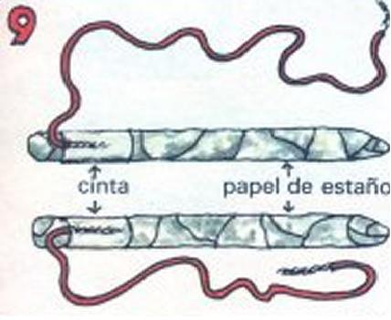 Luego haz dos agujeros en la tapa cerca de las dos salidas. Mete las puntas libres del cable de cada lápiz a través de los agujeros y únelos al terminal libre de la batería.