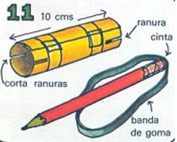 Después enrolla una tira de cartulina de unos 10 cm de largo para hacer un tubo bastante grande, para una pelotita. Corta dos ranuras en cada extremo. Pega una banda de goma con cinta al extremo de un lápiz.