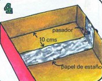 Corta una tira de papel de estaño de uno 5 cm de ancho. Pégala al fondo de la caja a 10 cm de un extremo y hacia arriba por un lado. Mete un pasador a través del lado donde está el papel de estaño.