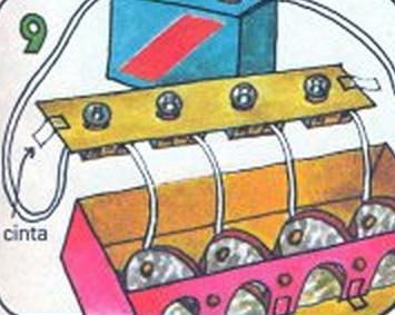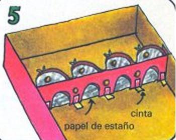 A continuación corta una tira de cartulina del mismo ancho de la caja. Haz cuatro agujeros y mete allí las cuatro bombillas. Pega los portabombillas en su sitio con cinta. Pega la tira con cinta a la caja.
