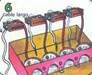 Después empezando en el extremo señalado en el dibujo, une el cable libre al próximo portabombillas como se ve en el dibujo. Une los otros dos portabombillas de la misma manera.