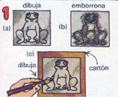Dibuja el modelo de esta rana en papel de calcar (a). Dale la vuelta al papel y emborrona el contorno por detrás (b). Ponlo al derecho y colocándolo sobre el cartón, dibuja el modelo definitivo (c).