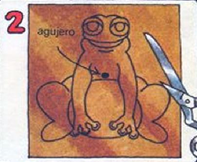 Recorta la silueta de la rana. Píntala de un color brillante y viscoso con ojos y boca muy grandes. Haz un agujero en la parte del cuerpo donde está la marca y pasa la cuerda por ahí.