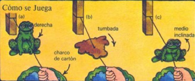 Cómo se juega: ata un extremo de cada cuerda a la pata de una silla, de manera que la rana quede en el centro con los pies rozando el suelo. Coloca un charco o estanque de cartón, en el otro extremo de cada cuerda. Cada jugador, debe sujetar el extremo de su cuerda y tiene que moverla de arriba a abajo para que la rana avance saltando por ella. La primera rana que llegue a su charco o a la línea de meta será la ganadora.
