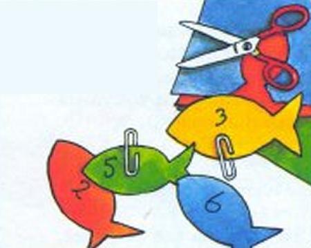 Después pinta los peces de distintos colores y escribe un número en cada uno de los peces y pon un clip igual como aparece en la imagen.