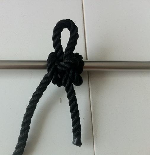 Debes pasar el cabo por detras del pasamanos o del lugar donde lo quieras atarlo. Imagina que le das forma de la letra M.
