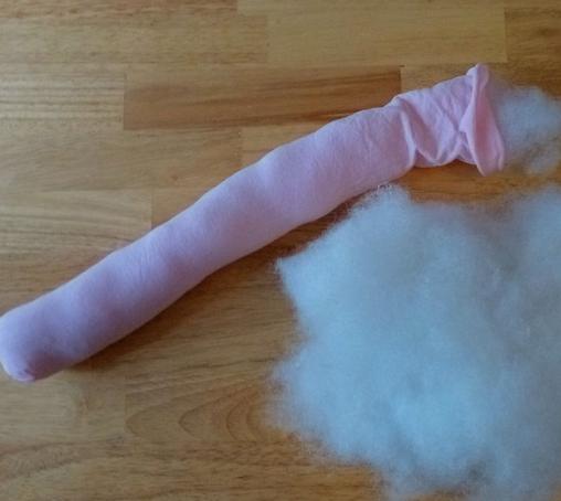 Cortamos la media de niña en dos partes, una con la pierna y en la otra parte dejamos el resto de la media. El trozo de una pierna será como un chorizo que rellenaremos con el polyester. Es muy fácil este paso para hacer el animalito de peluche.
