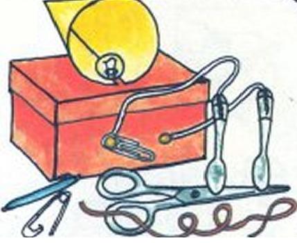 Sostén las dos cucharitas en las cosas que estás probando para ver su conductibilidad. Cuando encuentres alguna cosa que conduce la electricidad, la luz se enciende.