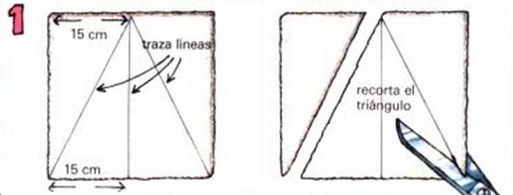 A continuación de uno de los triángulos sobrantes, mide 5 cm por un lado y traza una línea desde la medida hasta el ángulo superior. Corta con las tijeras por la línea marcada. Puedes tirar el trocito que te sobra.