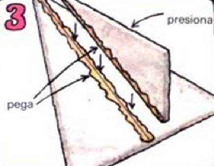 Después extiende abundante pegamento por el centro del triángulo grande y por el borde de la pieza recortado. Déjalo secar y a continuación presiona las dos partes donde pusiste pegamento, para que se unan bien.