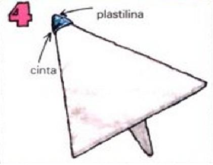 Da la vuelta al jet. Aplasta el trocito de plastilina al morro del avión y sujétalo con cinta adhesiva como aparece en la imagen.