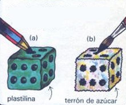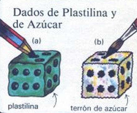 Para hacer un dado de plastilina y azúcar toma un trozo de plastilina y dale la forma de un cuho. Marca los puntos con un rotulador (a). También puedes hacer un dado de un terrón de azúcar si le pintas los puntos con tinta negra (b).