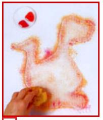 A continuación corta otro rectángulo de lienzo de igual medida al utilizado para pintar el dinosaurio esponjealo con naranja y rojo cubriendo la totalidad de la tela. Dejalo secar.