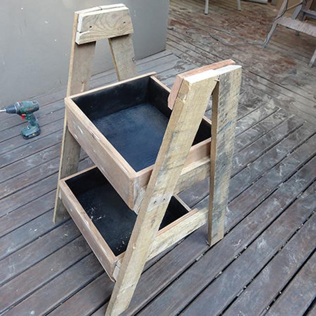 Para montar los cajones, tienes que atornillarlos en los travesaños inferiores y medios. Entonces necesitarás la ayuda de alguien que los sostenga mientras adjuntas el lado restante del estante. En la parte superior puedes clavar un par de tablas paralelas, y colocar algunas plantas encima.