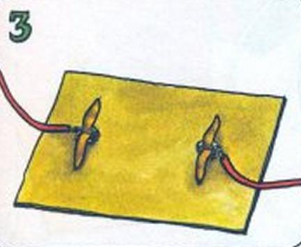 A continuación da la vuelta al cartón y enrolla el final del cable alrededor de un pasador. Enrolla un extremo de otro cable alrededor del segundo pasador.