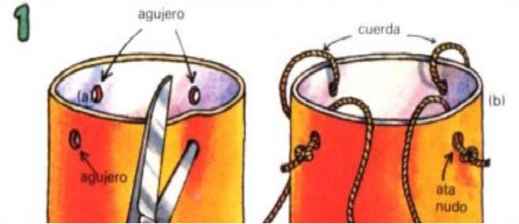 Recorta el fondo de una botella de plástico. Haz cuatro agujeros en la botella cerca del borde (a). Mete un trozo de cuerda por cada agujero. Haz un nudo final de cada cuerda por la parte de fuera de la botella (b).