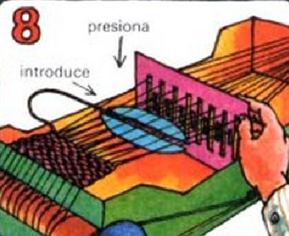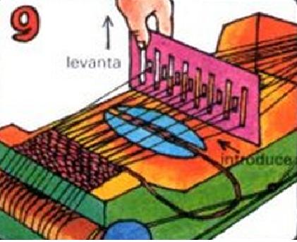 Para tejer la próxima vez, levanta el peine. Introduce la lanzadera por el lado contrario. Aprieta con el peine la parte ya tejida, antes de hacer una nueva pasada.