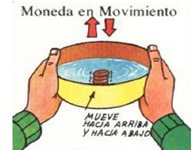 Ahora sujeta de forma que puedas ve la moneda. Mueve el envase despacio mirando fijamente la moneda. Mientra observas parece que se mueve de arriba a abajo en el envase.