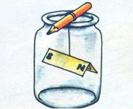 Si quieres sacar la brújula fuera de casa, cuelga el papel con un hilo y ata el hilo a un lápiz y deja que el papel cuelgue dentro de un recipiente de cristal como en el dibujo.