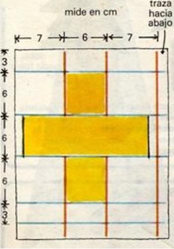 Primero de todo mide de arriba a abajo tres líneas como las rojas del dibujo. A continuación, comenzando por la parte superior, toma medidas para trazar cinco líneas como las azules.