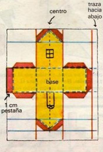 Luego marca dos triángulos iguales en la parte superior e inferior de la base y une los vértices. Después marca la base y los lados laterales. Ahora dibuja las pestañas, ventanas y puertas. Todo como se indica en el dibujo. Recorta la figura.