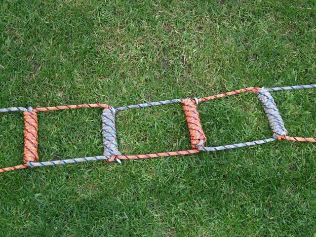 Sólo tienes que tomar dos cuerdas lo suficientemente largas, y construir una escalera portable. Yo he usados sogas de dos colores para que además quede bonita, pero esto ya es cosa tuya. Las sogas deben medir al menos 15 metros para una escalera que quieres que tenga 3 o 4.