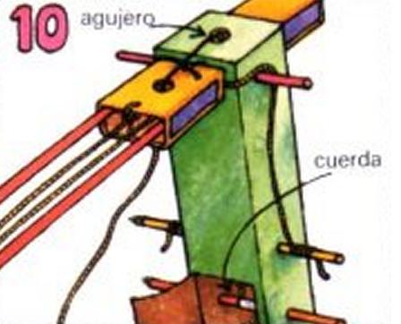 Para finalizar haz un agujero en un extremo de cada tira de cartón. Introduce las tiras a los extremos de cada lápiz y pégalas allí. Mete un clavo por los otros extremos de las dos tiras.