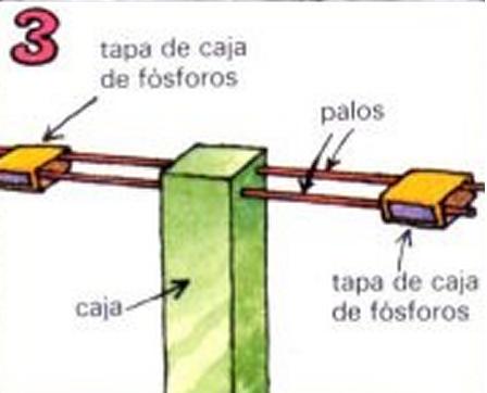 Desliza la tapa de una caja de fósforos sobre dos palos largos. Haz agujeros a los lados de la caja delgada y mete por ellos los palos largos. Haz lo mismo por el otro extremo.