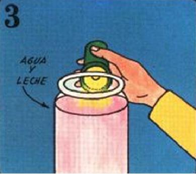 Para finalizar vierte dentro dos cucharadas más de leche. Enfoca la linterna por uno de los lados. El agua todavía se ve azul. Enfoca la linterna hacia ti y a través de la jarra el agua se verá rosa.