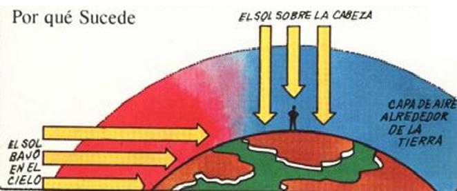 Por qué sucede. La tierra esta rodeada por una capa de aire llena de partículas de polvo y gotas de agua. El polvo y las gotas de agua, igual que la leche en un vaso de agua, dispersan la parte azul de la luz del sol y hacen que el cielo parezca azul. Cuando el sol está bajo en el cielo, parece rojo porque su luz tiene que ir más lejos a través del aire y sólo la parte de color rojo llega a tus ojos.