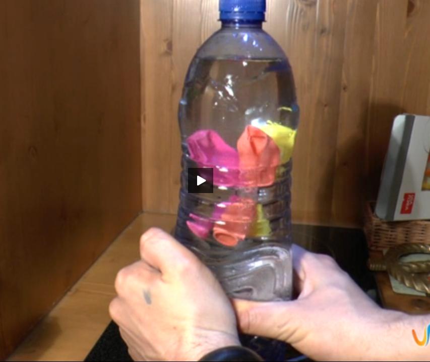 Este experimento con una botella de agua y unos globos, es uno de los más interesantes que tenemos y a la vez es algo complicado de explicar a los niños más pequeños. Se trata de ver como el cambio de presión en el interior de la botella hace que los globos suban y bajen como si fueran un mini submarino, que al fin y al cabo tiene un funcionamiento muy similar. En el siguiente artículo te explicamos cómo hacer el experimento del mini submarino.