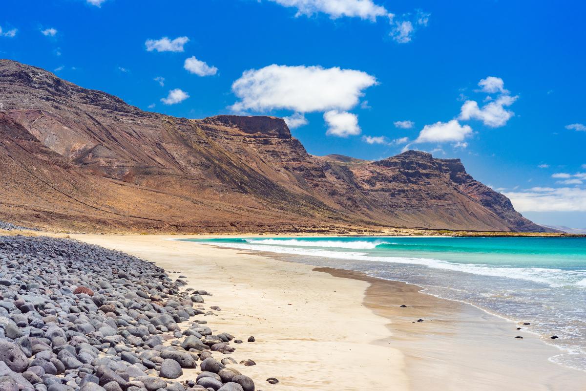 Viajamos ahora a La Graciosa, un pequeño islote que forma parte del archipiélago al norte de Lanzarote, para descubrir una de las playas más espectaculares y vírgenes: Playa de Las Conchas. Sin duda esta playa destaca por su belleza natural, formada por arena dorada y aguas azul turquesa que contrastan con el paisaje volcánico que la rodea, y sus impresionantes vistas, pues desde ella se puede disfrutar de los islotes vecinos más cercanos como alegranza, Montaña Clara o Roque del Oeste. Eso sí, aunque las aguas de la playa pueden parecer tentadoras para disfrutar de un buen baño, hay que ser precavido, pues hay fuertes corrientes en ella. Eso sí, podrás disfrutar de un paseo y admirar el paisaje si visitas la playa de Las Conchas.