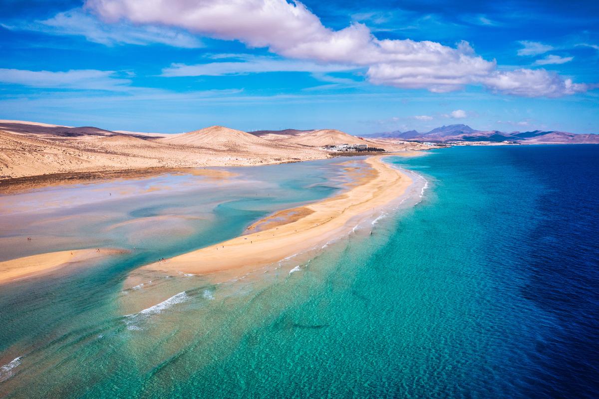 Ubicada en Fuerteventura, la segunda isla más grande de las Islas Canarias, se encuentra la playa de Sotavento, una impresionante playa reconocida por su belleza natural y su espacio tranquilo. Con una longitud de 9 kilómetros, esta playa ofrece vastos espacios de arena dorada y aguas cristalinas de color turquesa que combinan a la perfección con las montañas áridas que se encuentran a su alrededor, creando un paisaje único.