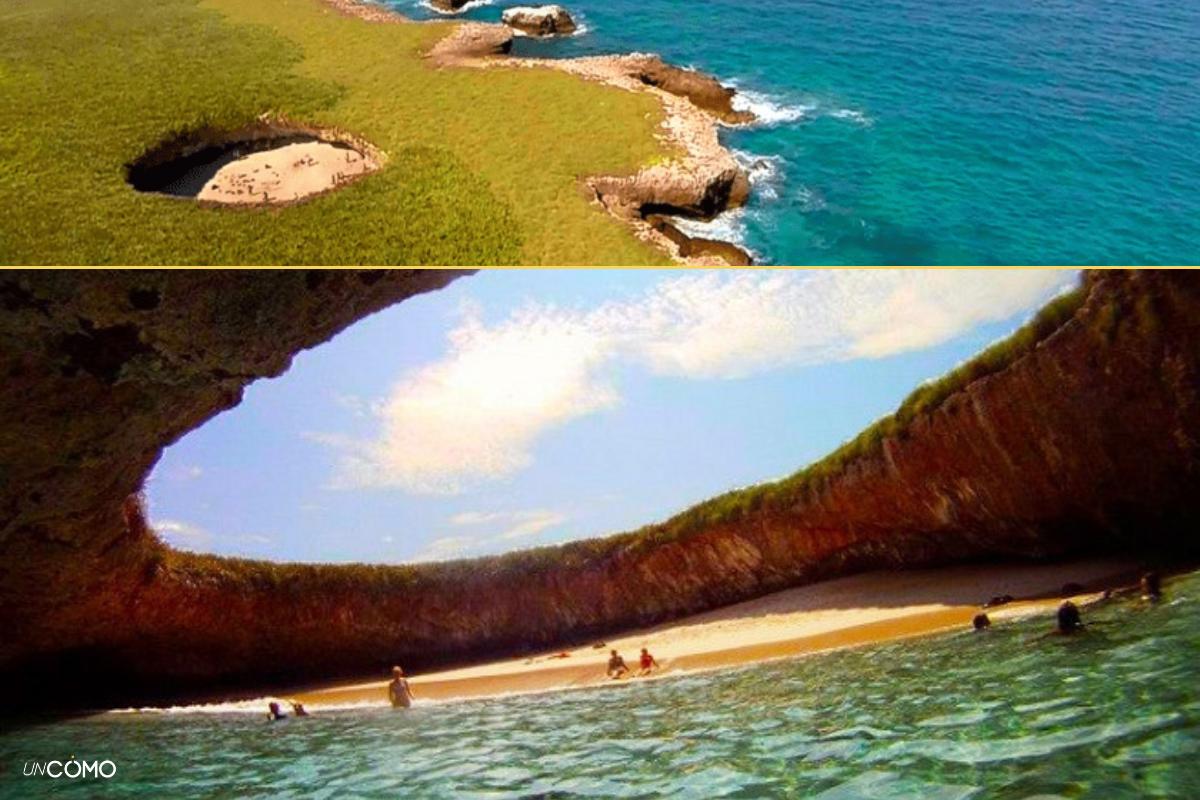 Se accede nadando o buceando por un túnel marino (con guía). Cuenta con aguas cristalinas y arena blanca en un entorno completamente natural. La teoría popular cuenta que, de entre las playas más bonitas de México, esta fue formada probablemente por actividad volcánica o pruebas militares antiguas.