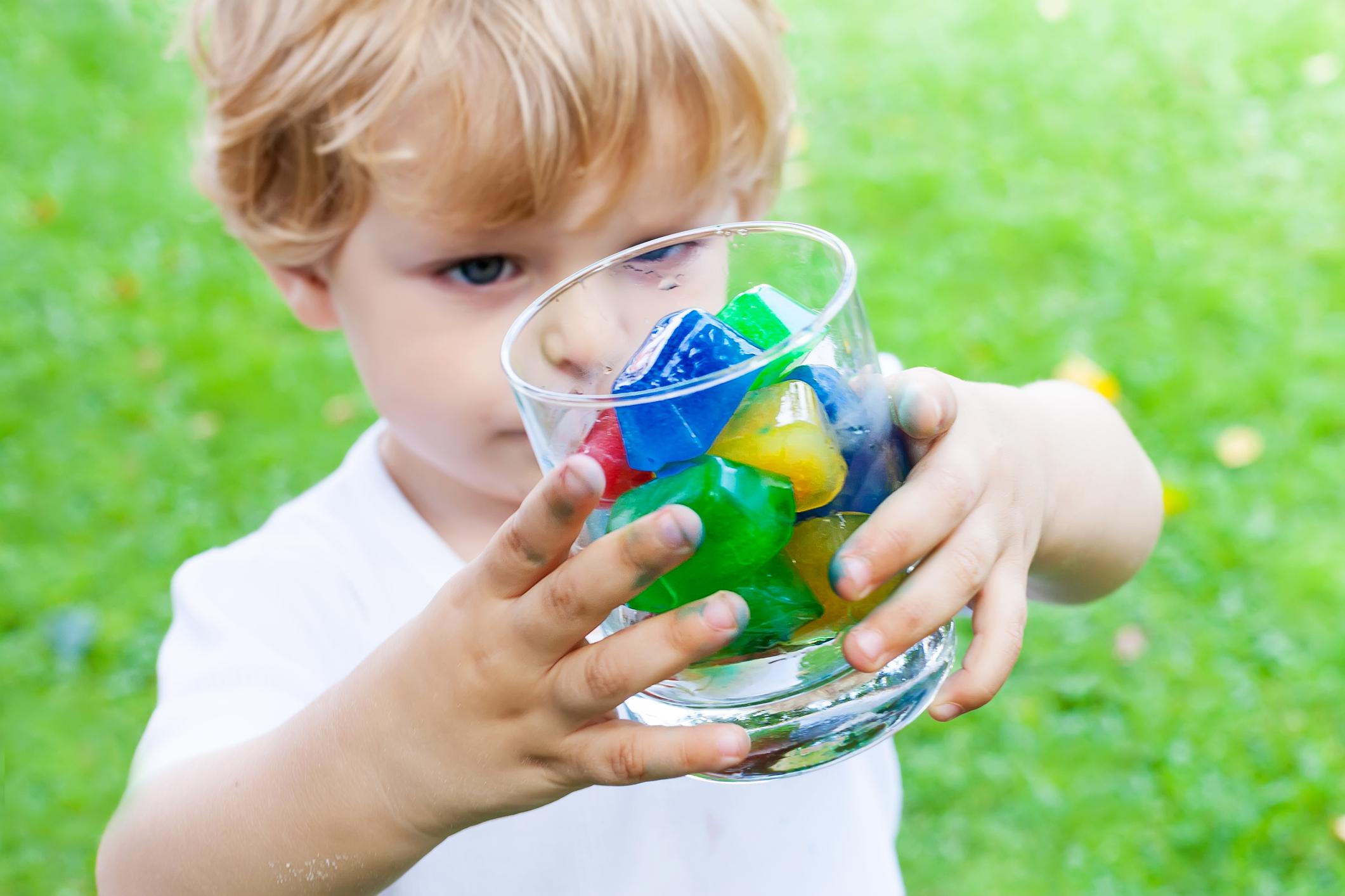 Se trata de un juego fresco y creativo. Se deben preparar con antelación algunos hielos de colores: se pone agua y témpera en tu cubitera. Cuando los hielos se hayan hecho, utiliza un rollo de papel para cogerlos y pintar con estos hielos de colores.