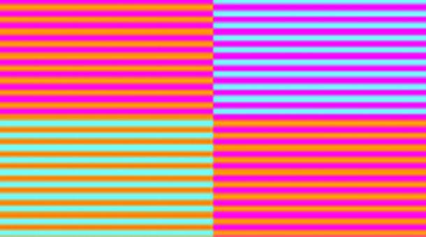 Un reto para los que disfrutan con las ilusiones y efectos ópticos. Pregunta a tus amigos de qué color son los fondos que se encuentran arriba a la derecha y abajo a la izquierda. Seguro que la mayoría contesta que son azul y verde respectivamente. La sorpresa será mayúscula cuando les digas que ambos fondos son del mismo color y que se trata de una ilusión óptica producida por el efecto de las rayas naranjas y magentas sobre ellos.