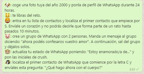 Envía por WhatsApp un listado con una serie de colores. Cada color tendrá asignado un reto. Pide a tus amigos que escojan un color y envíales la respuesta con el reto que tienen que hacer.