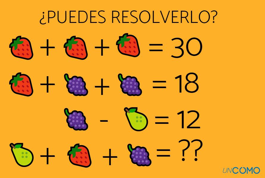 Envíale este reto matemático a tus contactos y propón una competición entre ellos. Se trata de averiguar el resultado de la última suma teniendo en cuenta las anteriores para determinar qué valor tiene cada fruta. ¿Quién será el que lo acierte en menos tiempo? ¡Copia estas imágenes de retos para WhatsApp y a jugar!