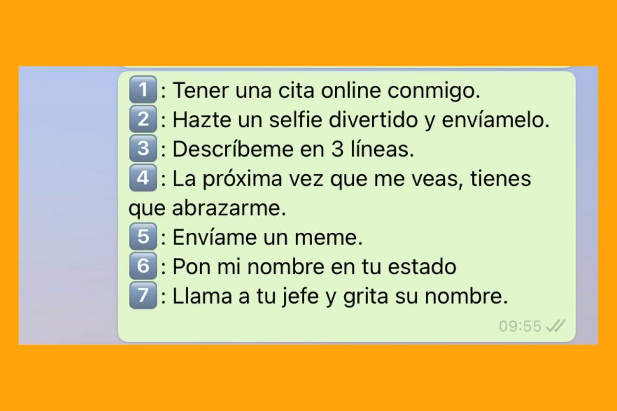 Este es el mensaje con el que retarás a tus amigos: "Escoge un número del 1 al 7 y te enviaré un reto. Los retos serán los siguientes: