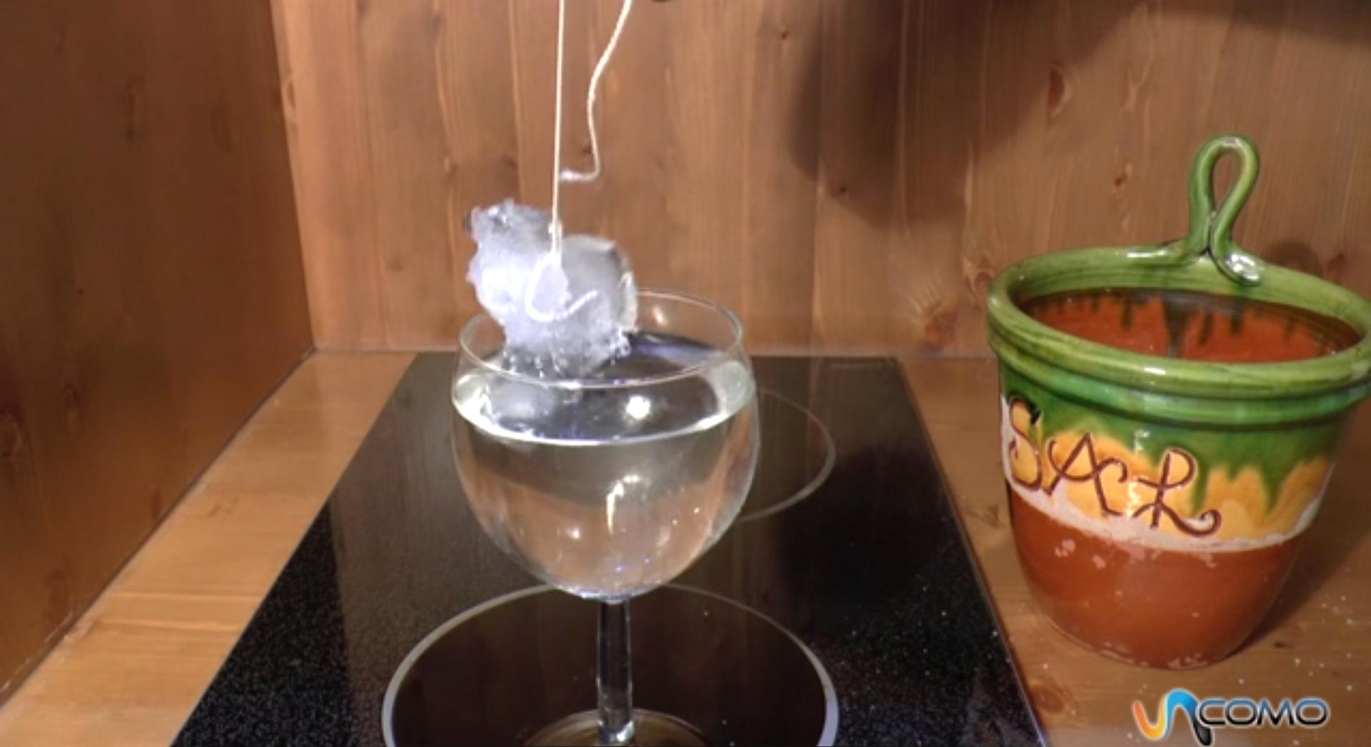 Cuando se mezcla agua con sal, se baja el punto de congelación por debajo de los 0 grados y por lo tanto podríamos enfriar latas mucho más rápido si pusiéramos hielo, agua, sal y latas a temperatura ambiente. Lo que sucede en este experimento es que la superficie del hilo se deshace momentáneamente pero luego se vuelve a congelar al momento, de tal manera que el pequeño hilo que le hemos pasado por encima se queda enganchado en pocos segundos. Si quieres ver cómo coger hielos con una cuerda en pocos segundos, no te pierdas el siguiente experimento de unComo.
