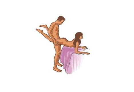 - El hombre se coloca de pie enfrente de la mujer y cuando se produzca la penetración, la mujer subirá las piernas hasta colocarlas a la altura de los hombros del hombre, para que la profundidad sea máxima.