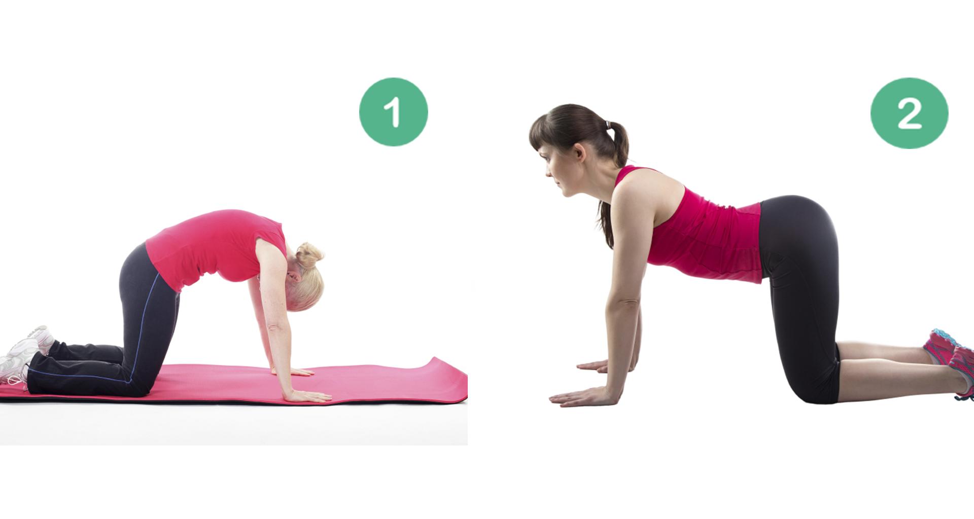 - Inhala profundamente a la vez que elevas despacio la cabeza y curvas la espalda hacia adentro, llevando el abdomen hacia el abajo.