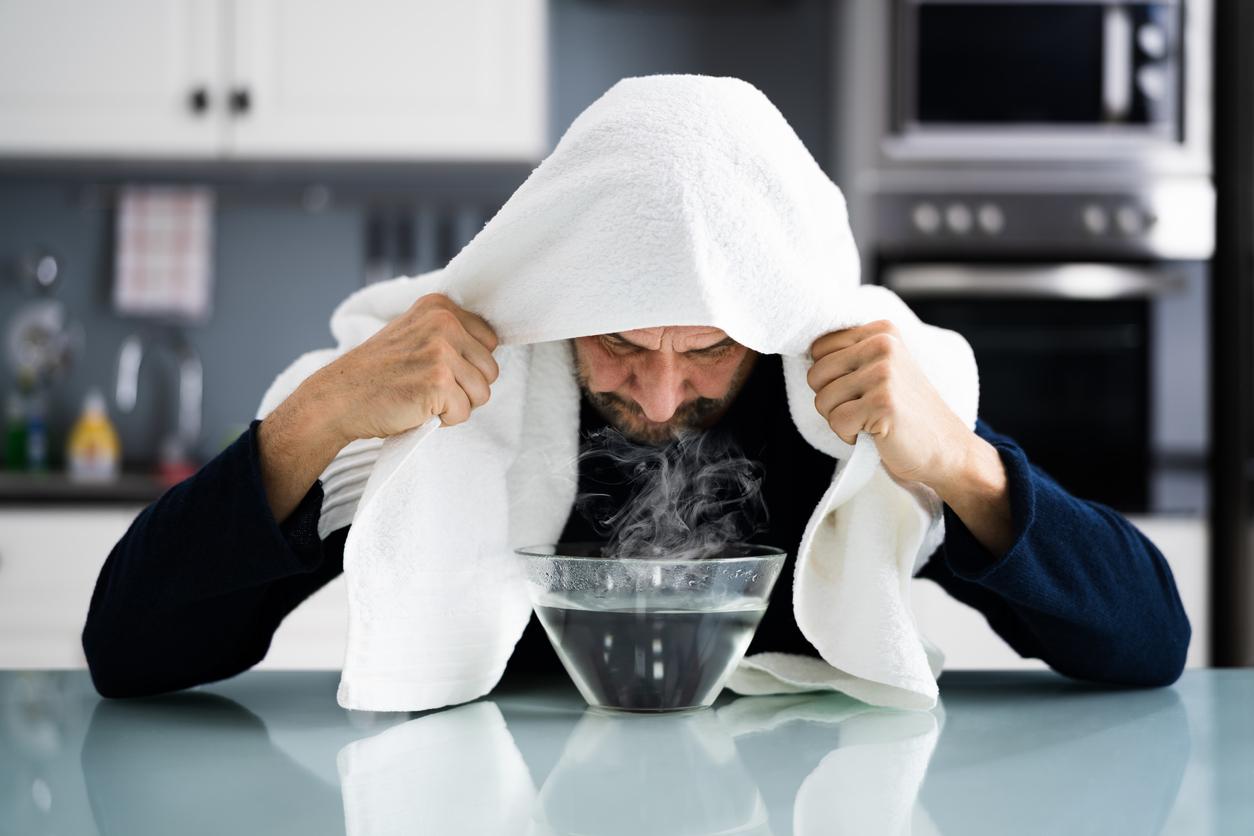 El enfermo o quien va a hacer vahos deberá permanecer sentado con la cabeza inclinada sobre la cazuela, cubriendo su cabeza y parte del tronco con una toalla grande para que no salga el vapor por los lados.