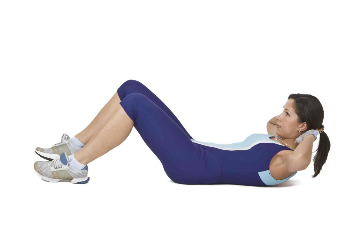 - Pon ambas manos detrás de la cabeza y sube las piernas para que queden paralelas al suelo.